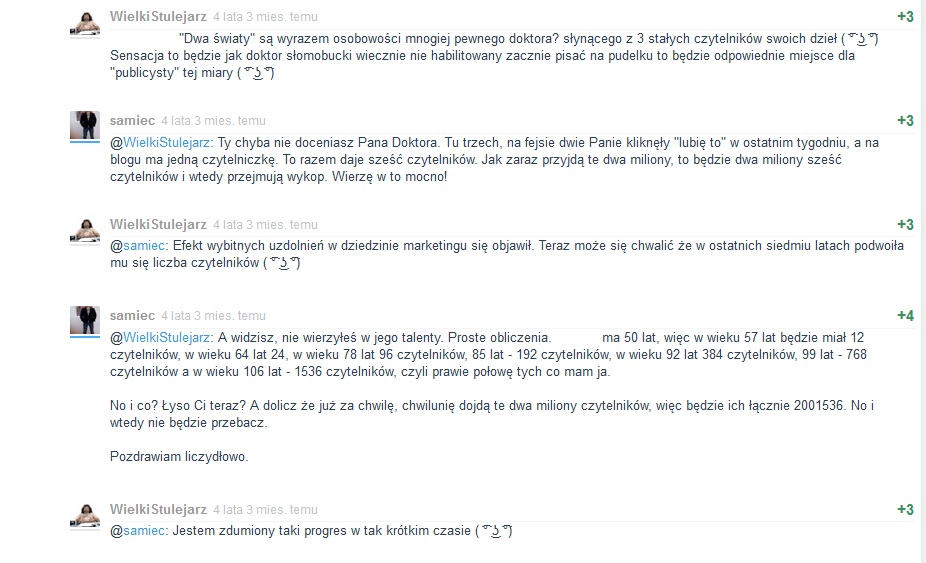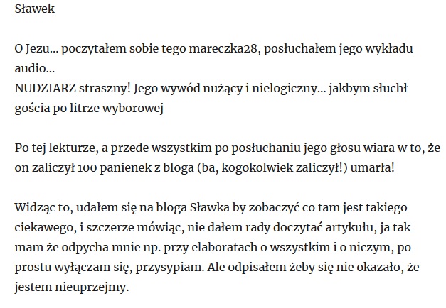 Nie wiem kto stał za nickami, które w taki sposób prowadziły ,,wymianę zdań”, nie wiem – ale się domyślam 🙂 tak samo jak domyślam się na czyje ,,polecenie” była prowadzona ta kampania hejtu i nienawiści wobec osoby Blogera.